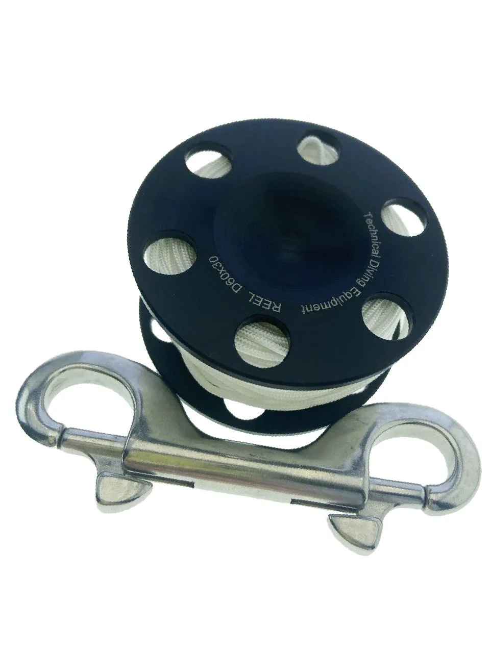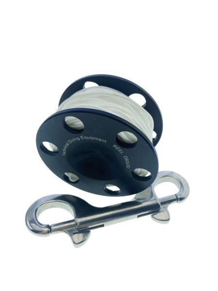 В комплект входит двусторонний карабин, с помощью которого легко и быстро фиксировать шпулю к D-орингу, буй-лини или другим элементам снаряжения. Отсутствие центрального отверстия уменьшает риск перехлёстов и попадания пальцев внутрь при сбросе линя, а также повышает компактность.