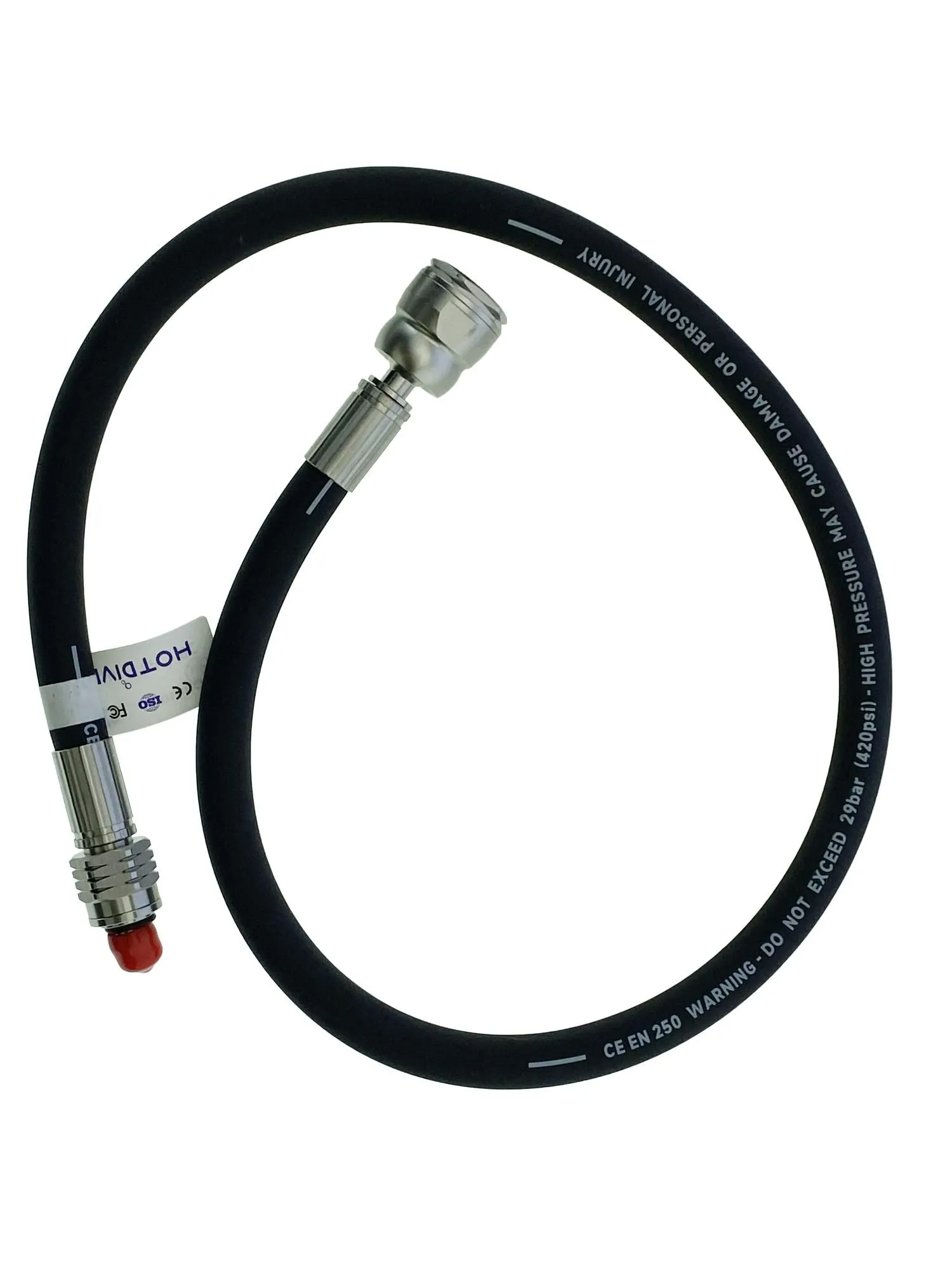 Входная резьба для подключения к первой ступени составляет стандартные 3/8 дюйма. Это гарантирует широкую совместимость с большинством регуляторов, представленных на рынке, делая шланг OpenDive универсальным выбором для вашего дайверского комплекта.