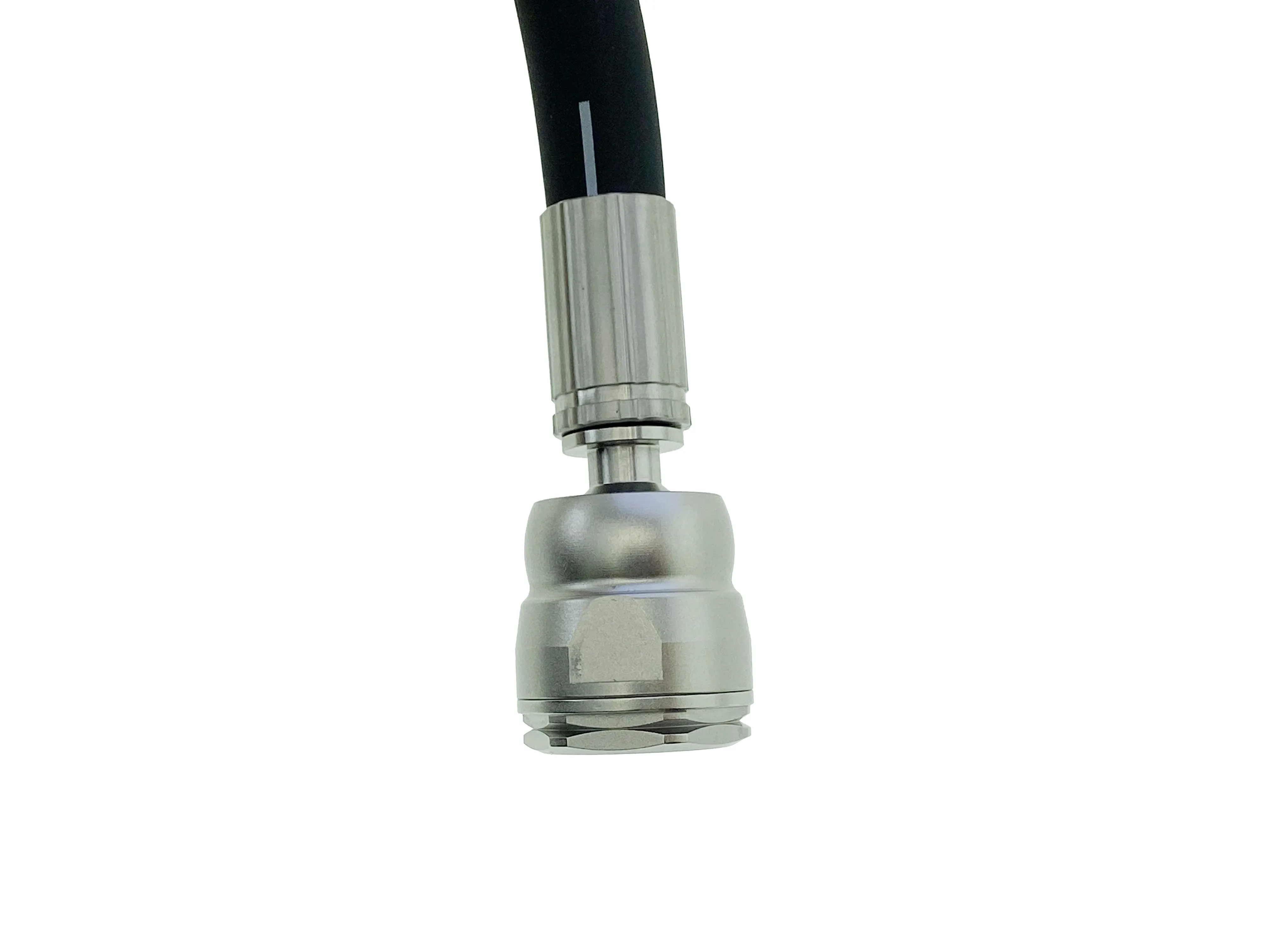 Инновационный шарнирный штуцер из нержавеющей стали выполненный из высокопрочной нержавеющей стали. Этот элемент играет критически важную роль, предотвращая заломы и перекручивания шланга в месте соединения с регулятором. Шарнирное соединение обеспечивает максимальную гибкость, позволяя шлангу свободно вращаться и адаптироваться к движениям дайвера, значительно продлевая срок службы изделия и повышая комфорт использования.