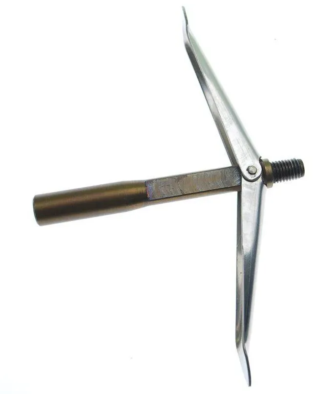 Наконечник со сменным оголовьем изготовлен из нержавеющей стали марки 40Х13. Оголовье наконечника исполнено в виде трехгранной заточки, закалено до 45 ед. HRC. Отличная проникающая способность. Общая длина 115 мм, диаметр оголовья 10 мм. Два лепестка полностью прячутся за оголовьем. Резьба на сменных наконечниках M7.