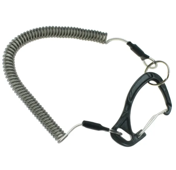 Пружинный ретрактор с карабином и кольцом. Может использоваться для фиксации приборов, аксессуаров, фототехники, фонарей и т.д. Пружина растягивается на расстояние до 120 см.