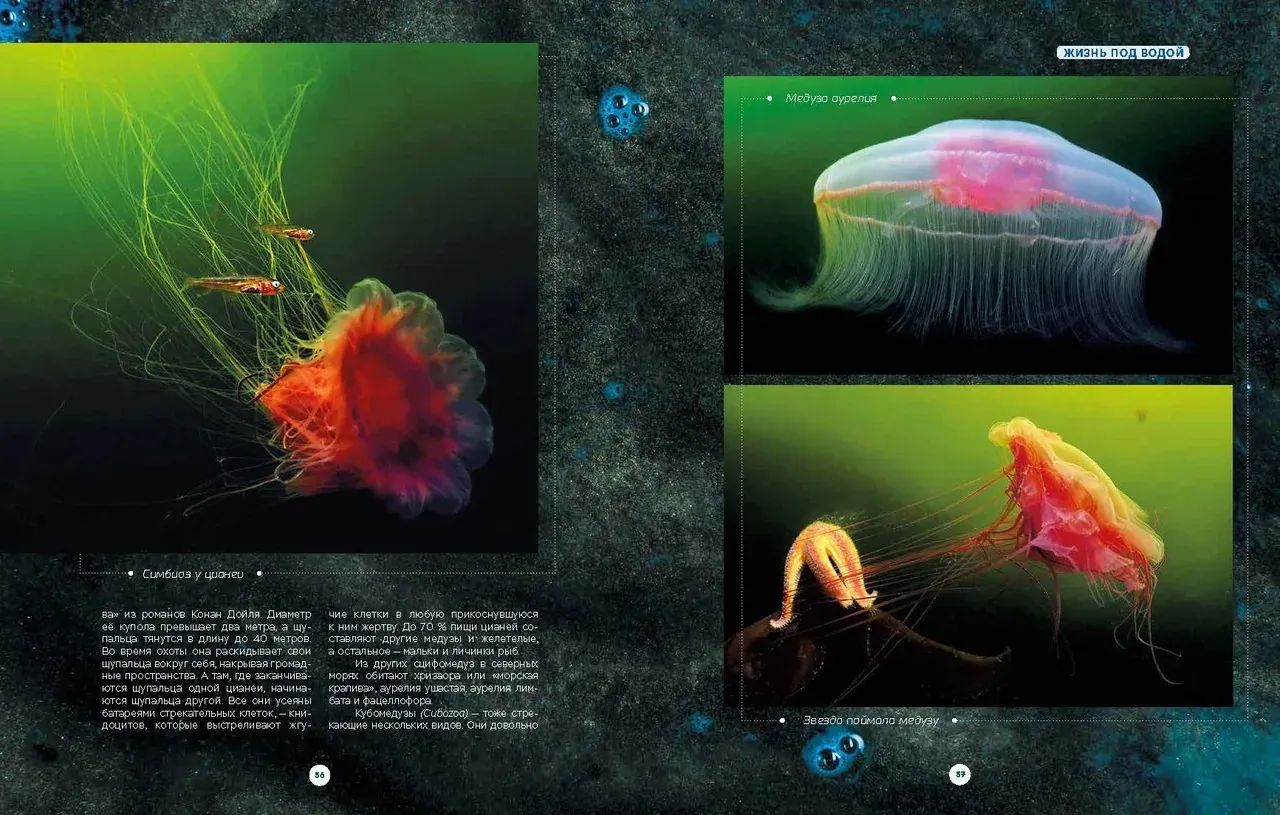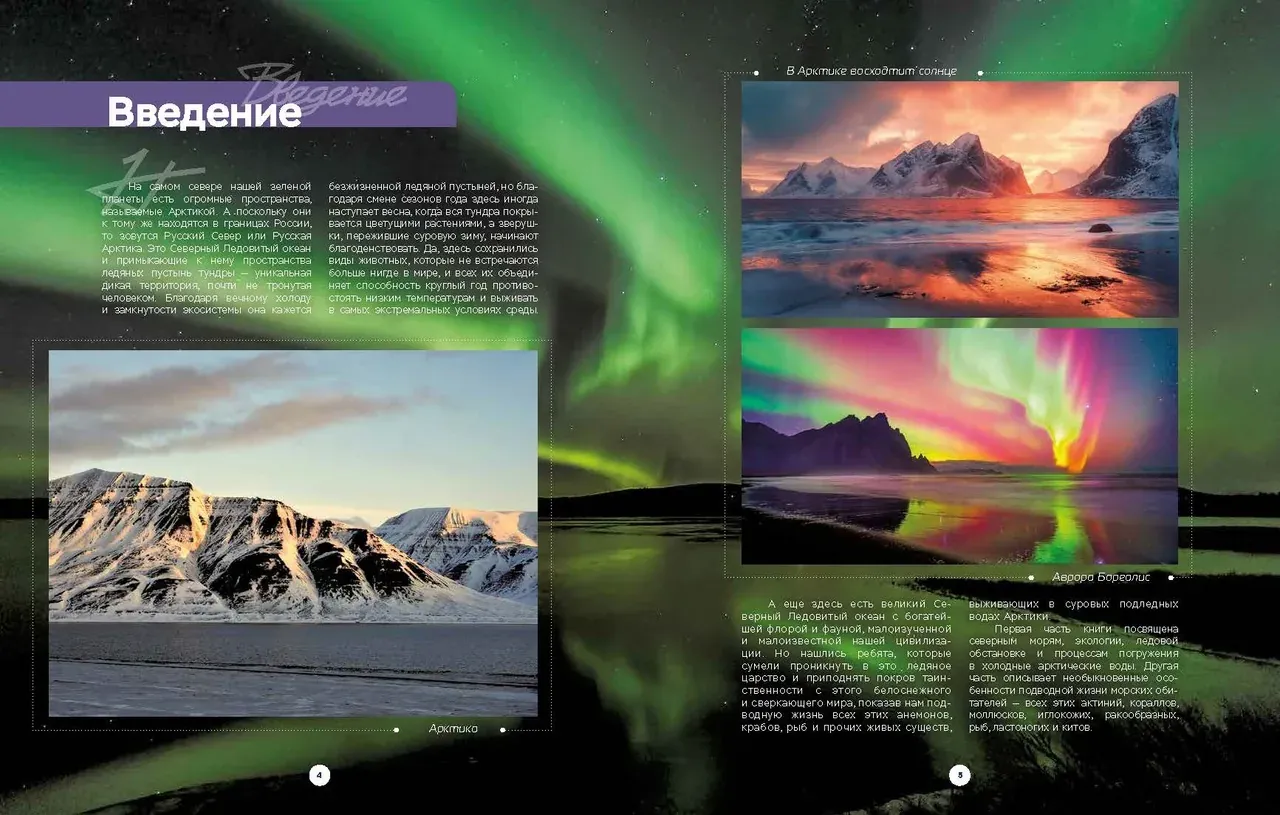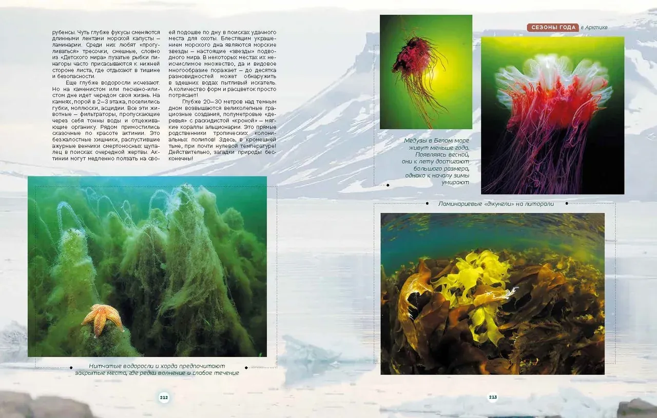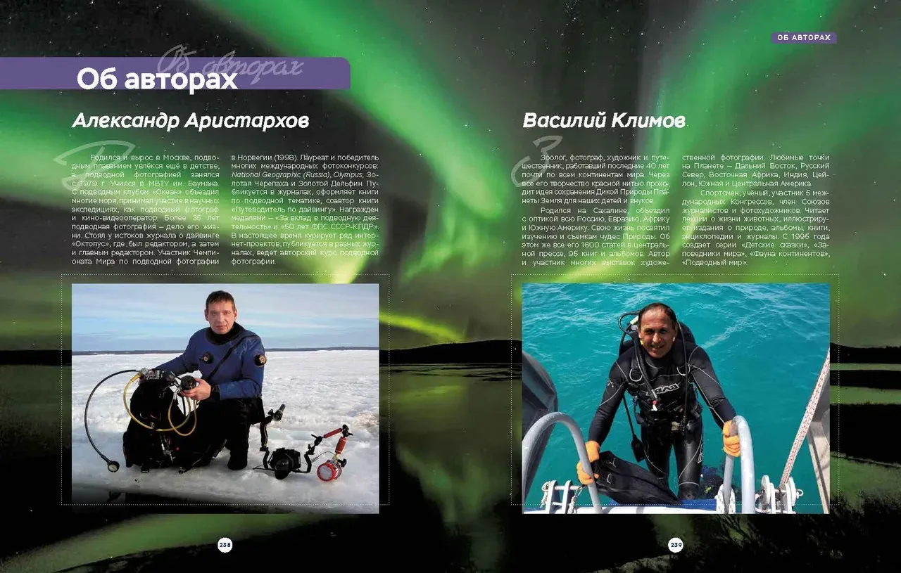 На самом севере нашей зелёной планеты есть огромные пространства, называемые Русский Север или Русская Арктика. Это Северный Ледовитый океан с богатейшей флорой и фауной. Подводный мир арктических морей суров, своеобразен, но по-своему прекрасен и интересен. Здесь, в темноте и холоде, под зеленоватым пологом морских волн и льдов процветают настоящие кораллы, шевелятся огромные плети жёлтых и бурых ламинарий, раскидывают свои охотничьи сети коварные медузы цианеи, а яркие актинии распускают свои разноцветные щупальца для ловли планктона, медуз, рачков и рыбьей мелочи. Дно украшают яркие морские звезды, а меж ними - скопления зелёных морских ежей. Скалы и камни покрыты сплошным ковром разноцветных губок, здесь же ютятся морские огурцы - кукумарии. В холодной воде очень богат мир фито- и зоопланктона, водных растений, моллюсков, губок, ракообразных и иглокожих. Под водой нет и клочка голого камня - всё покрыто многоэтажными обрастаниями самых разных подводных жителей, составляющими здесь устойчивые морские экосистемы. Авторы - профессиональные биологи и дайверы сумели приподнять покров таинственности с этого чудесного сверкающего мира, показав нам подводную жизнь уникальных существ, выживающих в суровых водах Арктики, закрытых по полгода изумрудными льдами и торосами. Первые две главы книги посвящены северным морям, экологии, ледовой обстановке и процессам погружения в холодные арктические воды. Две другие описывают особенности подводной жизни морских обитателей, - всех этих актиний, кораллов, моллюсков, иглокожих, ракообразных, рыб, ластоногих и китов, а также смену сезонов года в Арктике.