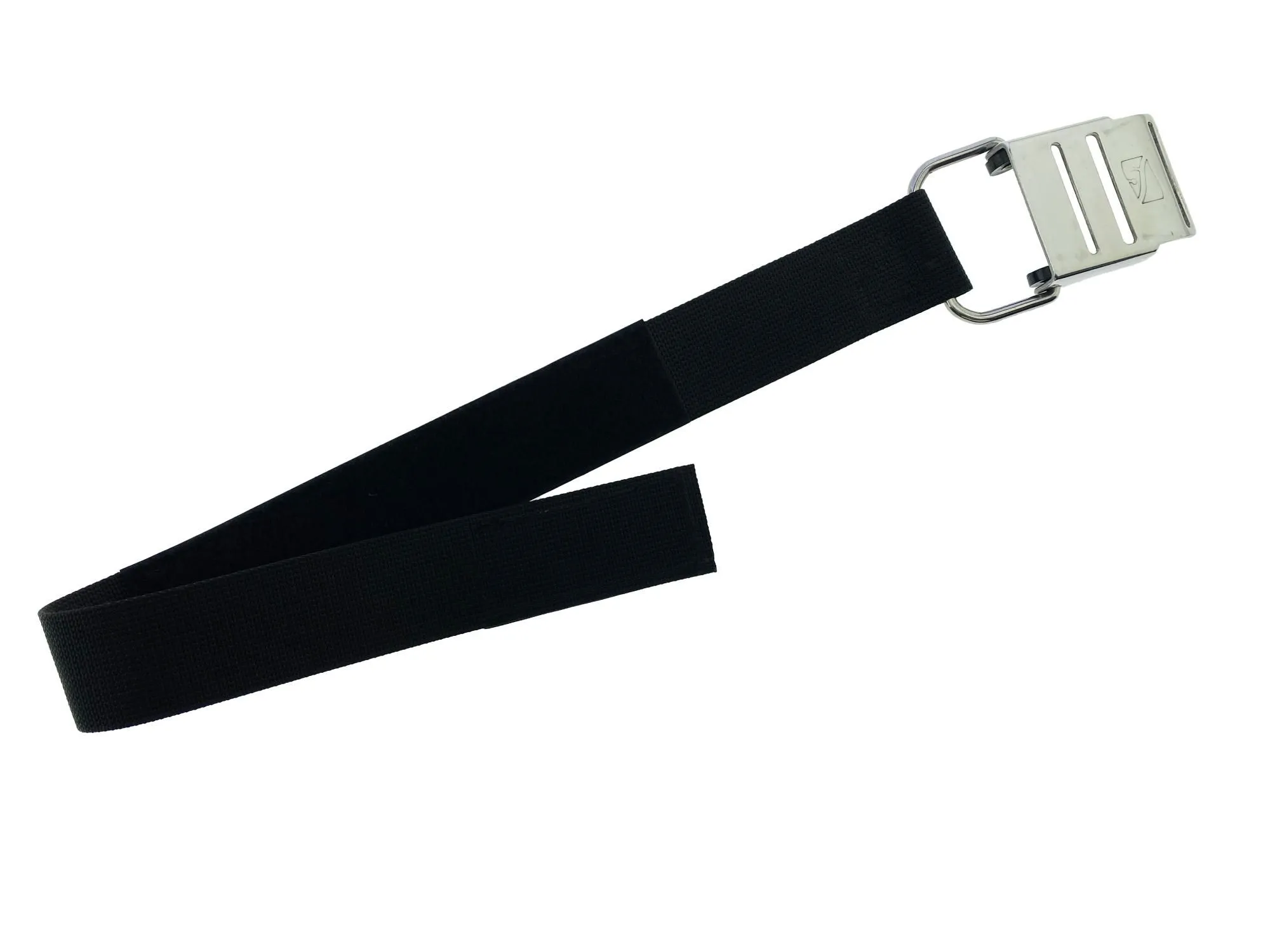 Ремень баллонный DiveRite с металлической пряжкой для фиксации баллона. Одной из его основных особенностей является крепление на липучки с сильной фиксацией, что обеспечивает надежную поддержку баллона и предотвращает его смещение во время погружения.