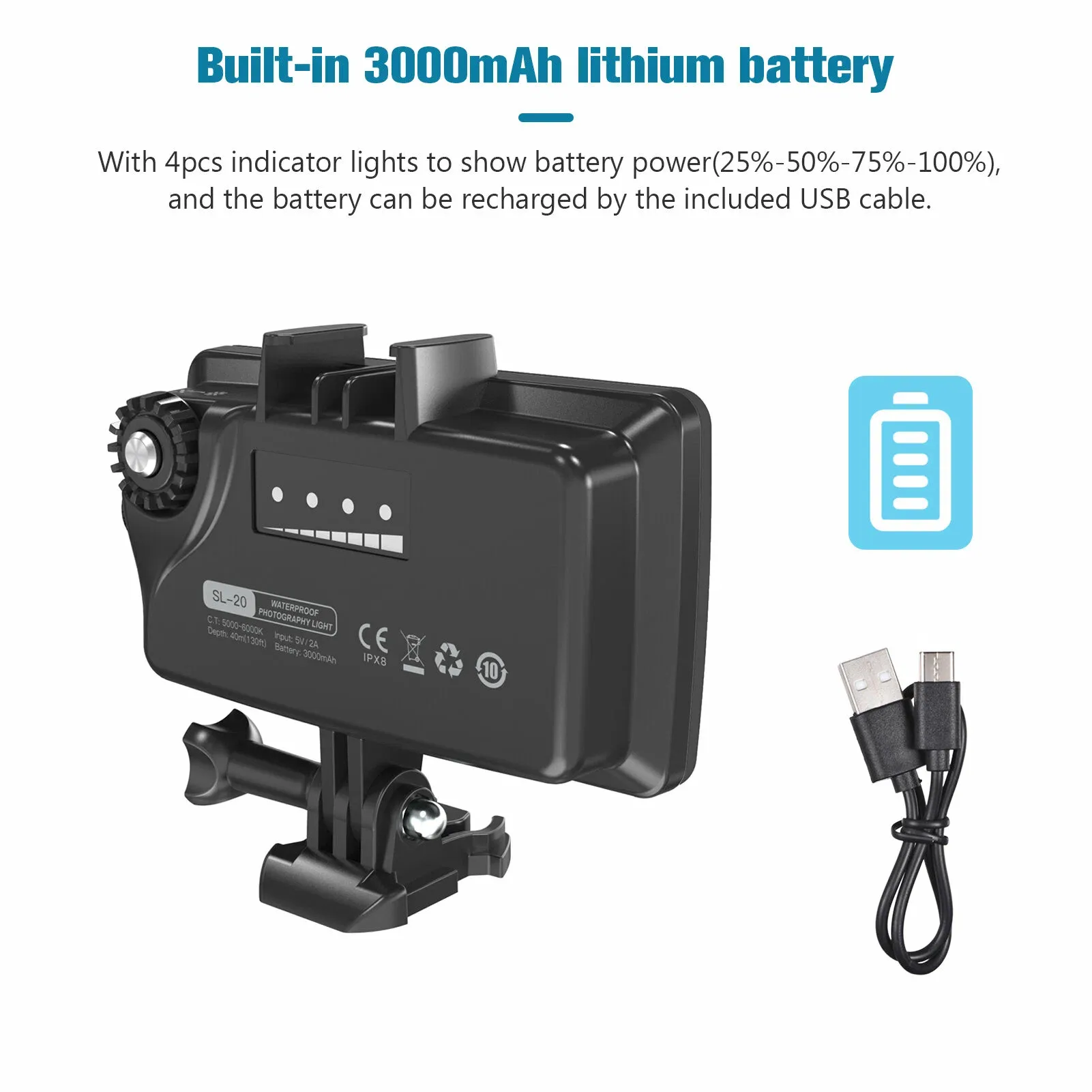 Sea Frogs SL-20 оснащен встроенным литиевым аккумулятором емкостью 3000 мАч, который обеспечит длительное время работы устройства. Эффективный угол освещения в 120 градусов позволяет освещать широкую область, идеально подходящей для подводной съемки. Также осветитель обеспечивает надежное погружение на глубину до 40 метров, что делает его отличным выбором как для профессиональных фотографов, так и для любителей подводного спорта.