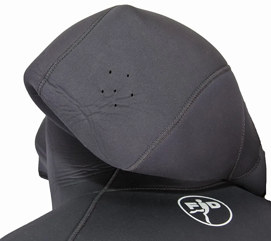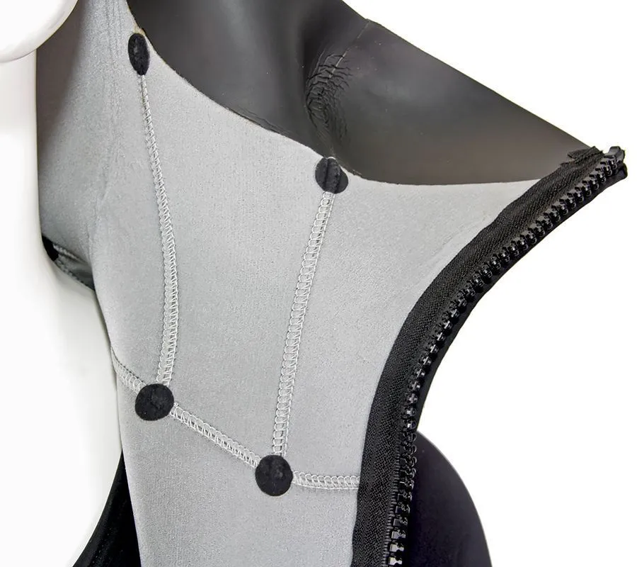 Молния продолжается до уровня уха — это улучшает лицевую обтюрацию и даёт свободный поворот головы без натяжения. Прочная молния снабжена внутренней планкой с гладким покрытием, что значительно уменьшает поток воды через застёжку. По запястьям, лодыжкам и лицу установлены обтюраторы из 4 мм неопрена «гладкая кожа» с повышенной прочностью на разрыв, они эффективно удерживают тепло и защищают от проникновения воды. Встроенный шлем с улучшенной лицевой обтюрацией и клапаном для удаления воздуха обеспечивает удобную подгонку головы и контроль плавучести воздушной прослойки.