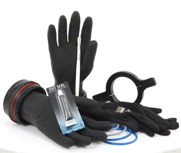 В комплект системы сухих перчаток входит пара перчаток Ansell Extra™, внутренние термоперчатки из флиса, два модуля сухих перчаток, три уплотнительных кольца, фиксирующий инструмент, клей-герметик и кисточка для его нанесения.