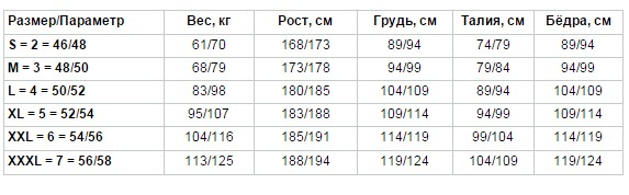 Размерная таблица: