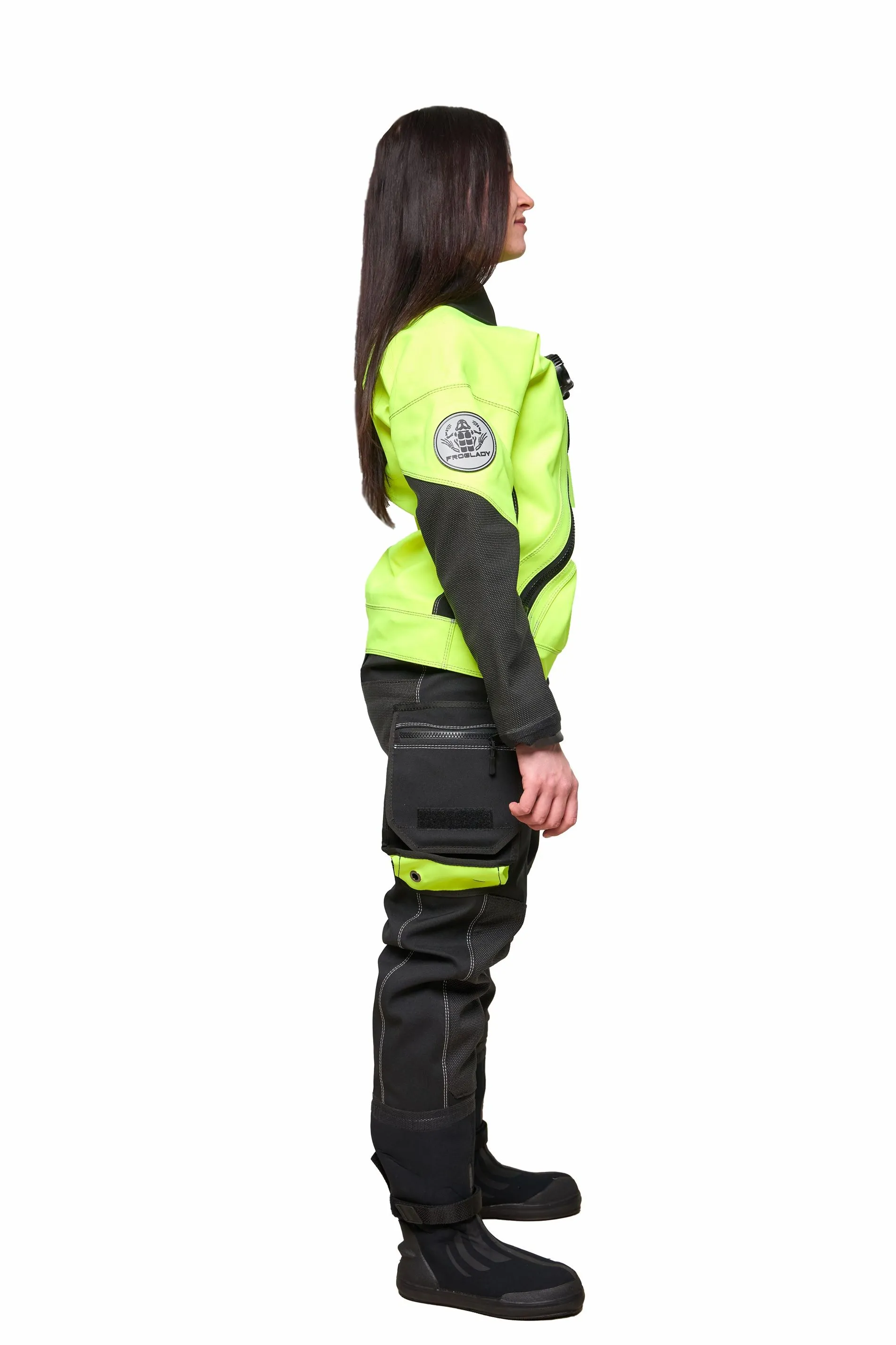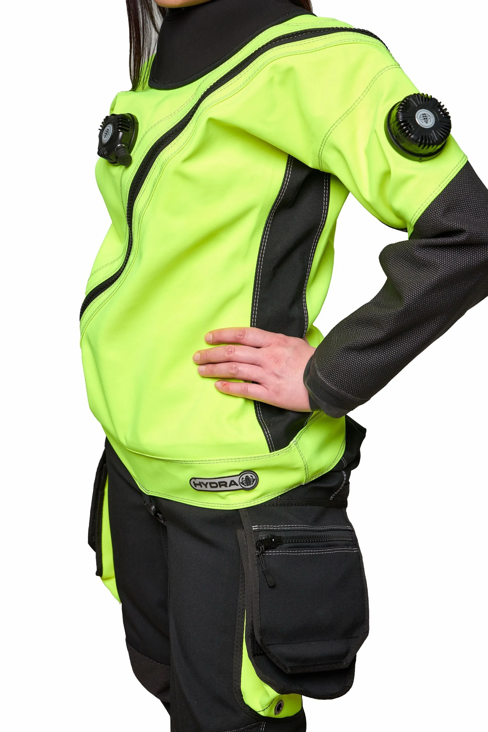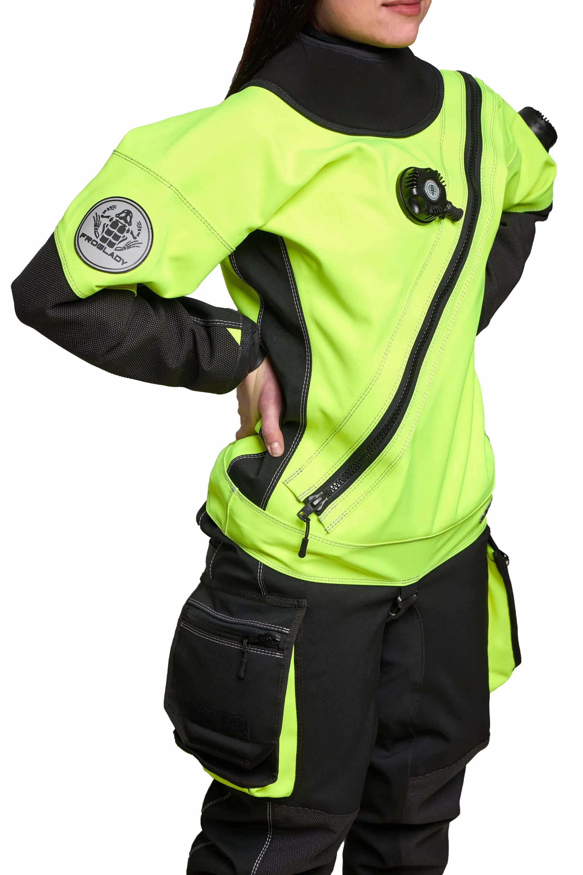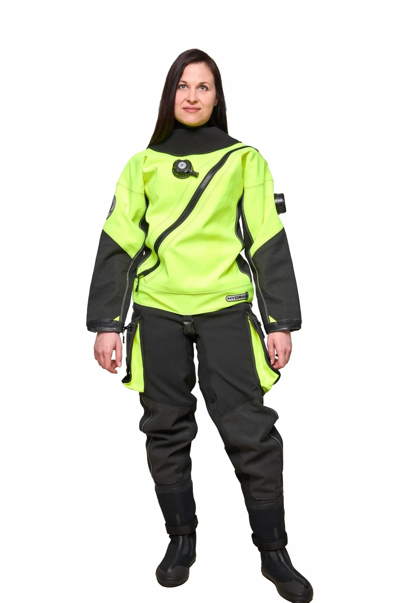 Сухой гидрокостюм женский Froglady Hydra изготовленный из прочного триламината. Плотность материала 460 г/м2. Передняя диагональная молния и телескопический торс обеспечивают легкое одевание и снятие, и значительно повышает возможность свободного движения при наклонах и изгибах. Швы проклеены лентой и аквашуром.