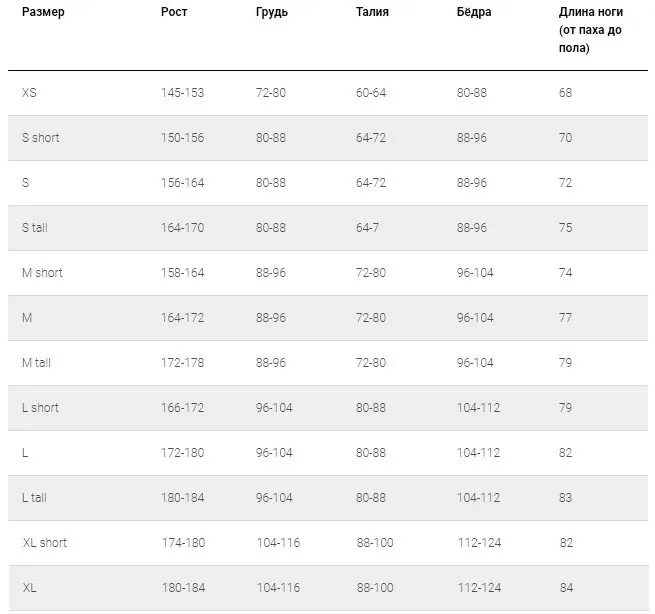 Размерная таблица для женщин
