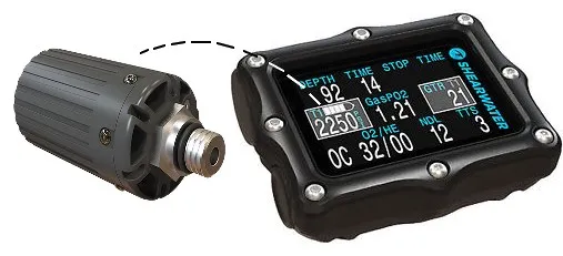 - Возможность подключения до двух беспроводных датчиков давления газа в баллонах (трансмиттеров), способных передать данные о давлении газа в баллоне, в следствии чего компьютер производит расчет оставшегося времени погружения, что также отображается на экране.