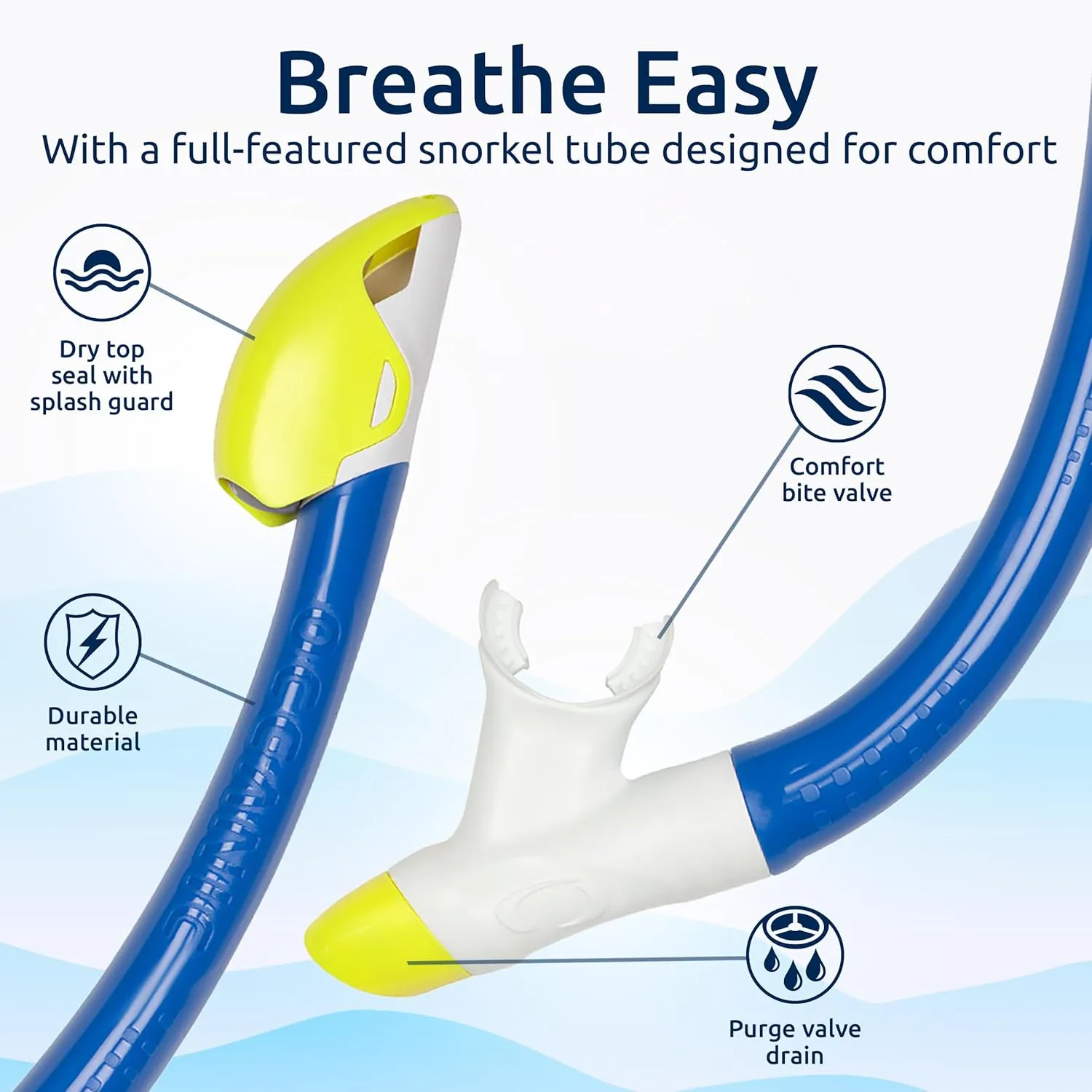 - СУХОЙ ВЕРХНИЙ ТРУБОК ДЛЯ ЛЕГКОГО ДЫХАНИЯ: Забудьте о заглатывании воды! Высокотехнологичное снаряжение для снорклинга включает в себя систему сухого верхнего закрытия клапана трубки, которая герметично закрывается при погружении, предотвращая попадание воды и обеспечивая беспрепятственный поток воздуха. Мягкий силиконовый загубник разработан для максимального комфорта, предотвращая усталость челюсти, чтобы вы могли дольше исследовать воду без напряжения.