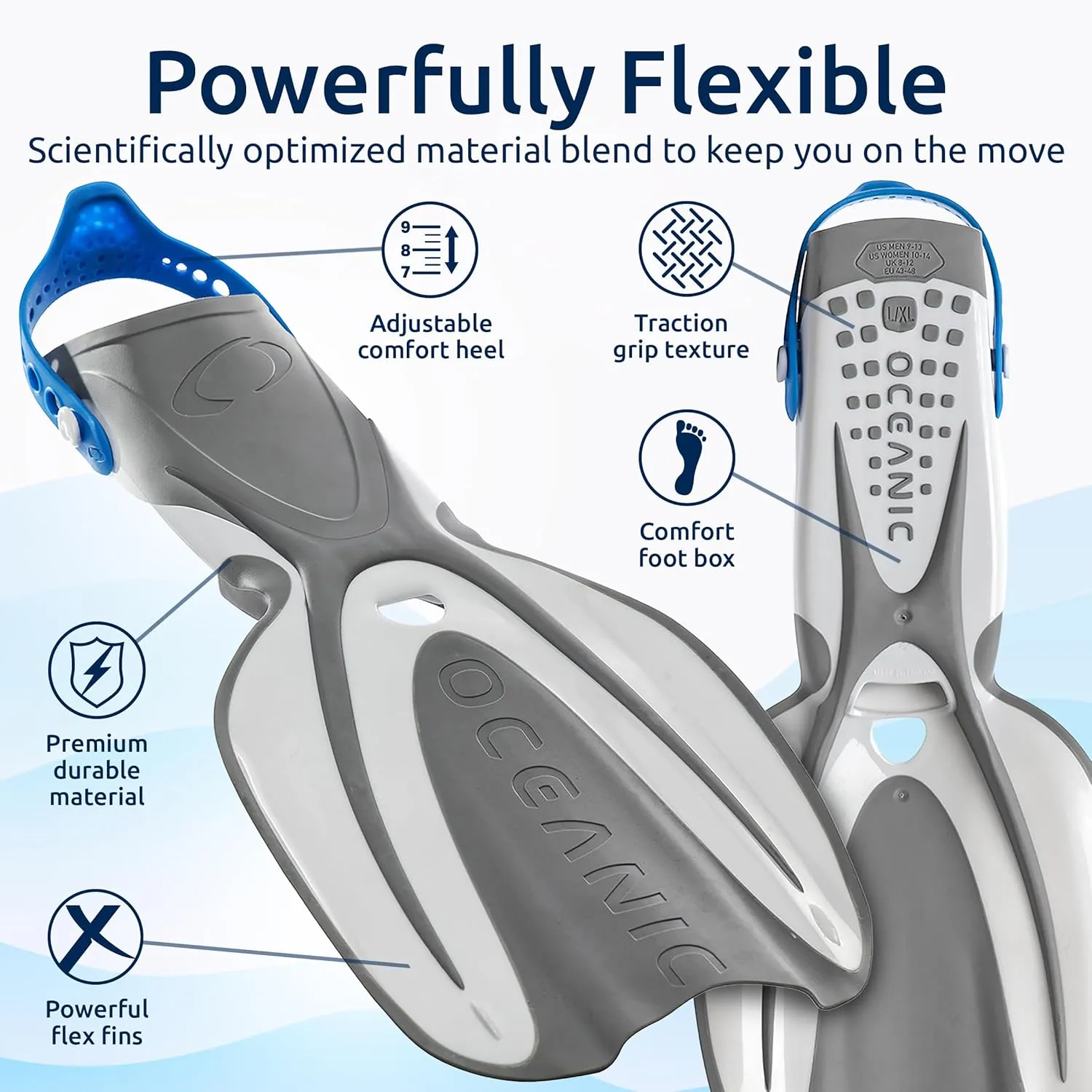 Входящие в комплект ласты имеют динамичную X-образную форму, сочетающую мощность и комфорт, с лопастью, разработанной для повышения эффективности. Ласты изготовлены из технополимера и высокоэффективной термопластичной резины для эффективности и долговечности. Их размеры легко регулируются благодаря поворотному ремешку, охватывающему широкий диапазон размеров.