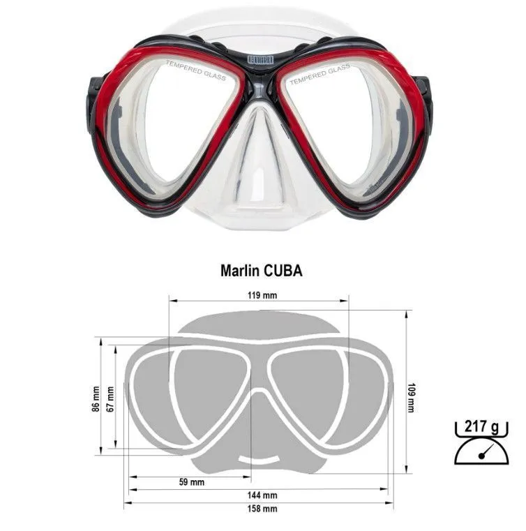 Маска Marlin Cuba с двумя линзами для дайвинга и снорклинга. Мягкая гипоаллергенный силиконовый обтюратор идеально подходит для всех типов лица, а прозрачный цвет увеличивает поле зрения.