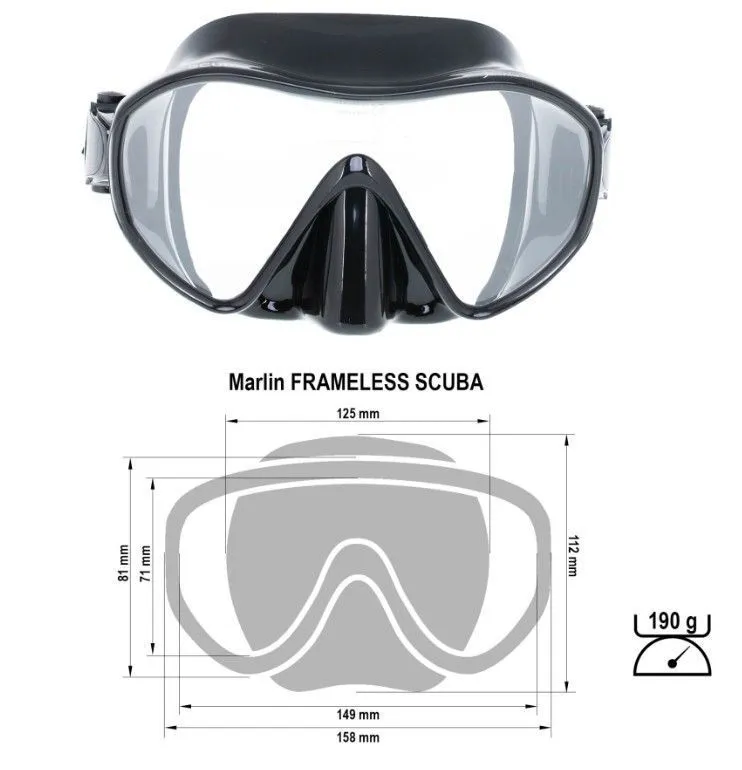 Маска Marlin Frameless Scuba Совокупность панорамного стекла, небольшого подмасочного пространства и качественного мягкого силикона обеспечивает максимальный обзор и комфорт использования. Удобный мягкий ремешок с фиксаторами позволяет быстро отрегулировать прижим маски к лицу.