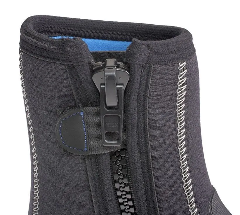 Дополнительным преимуществом являются усиленные участки: мысок, подъем и пятка, что гарантирует долговечность в условиях активного дайвинга. Шпора на пятке помогает удерживать ремешок ласты, что значительно улучшает общую готовность к погружению. Также стоит отметить надежные молнии YKK10, защищённые липучкой от случайного расстегивания, которые делают процесс одевания и снятия ботов простым и удобным.