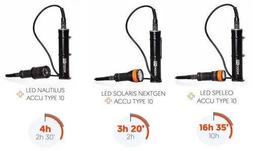 Accu Type 10 от Ammonite System - это литий-ионный аккумулятор емкостью 10 Аh, в прочной канистре с твердым анодированным покрытием. Accu Type 10 обеспечит от 2,5 до 4 часов горения для светодиодной головки Nautilus, от 2 до 3+ часов для головки Solaris и от 10 до 16 часов для головки Speleo. В комплект не входит зарядное устройство, кабель или световая головка.