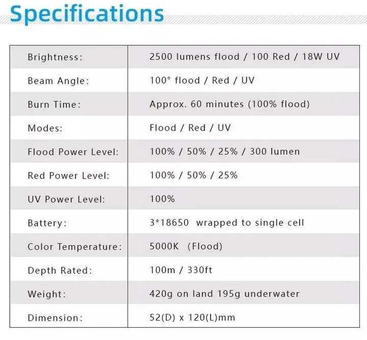 Подводный осветитель Weefine Smart Focus 2500 осветитель для подводной видеосъемки. Компактный, современный источник подводного света с потрясающими возможностями. Три основных режима: угол светового пучка 100 °, красный луч 100 люмен и темно-синий луч 18 ватт «UW». Максимальная выходная мощность составляет 2500 люмен. Глубина погружения до 100 метров.