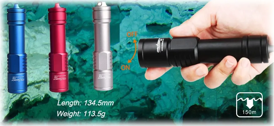 Фонарь OrcaTorch D520 это небольшое устройство с очень ярким лучом выдающим в максимальном режиме не менее 1000 Люмен, отличным качеством сборки и серьезным показателем по максимальной глубине погружения до 150 метров. Фонарь работает на одном аккумуляторе формата 18650 и комплектуется зарядным устройством.