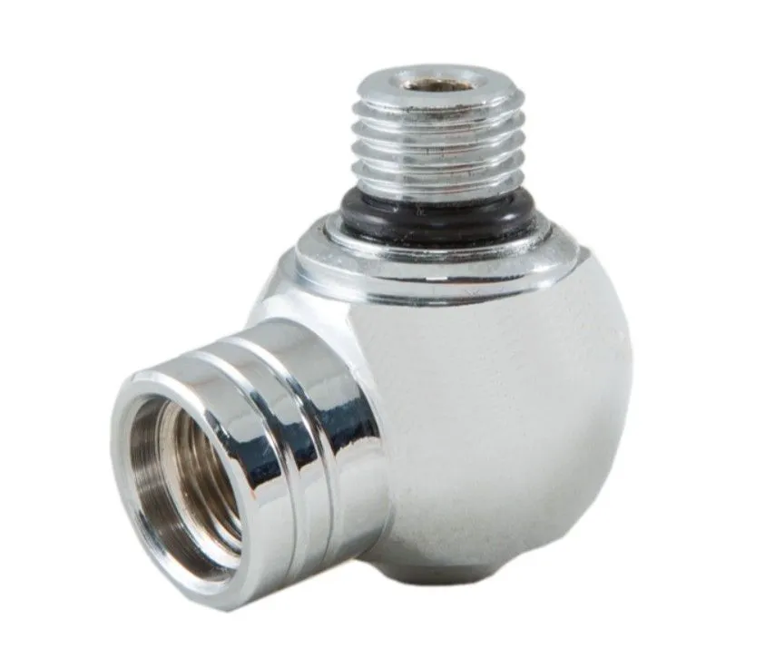 Угловой переходник ODS предназначен для подключения манометра к первой ступени регулятора под углом 90°, сохраняя стандартную резьбу 7/16" UNF с обеих сторон (внешняя/папа на одну сторону и внутренняя/мама на другую).