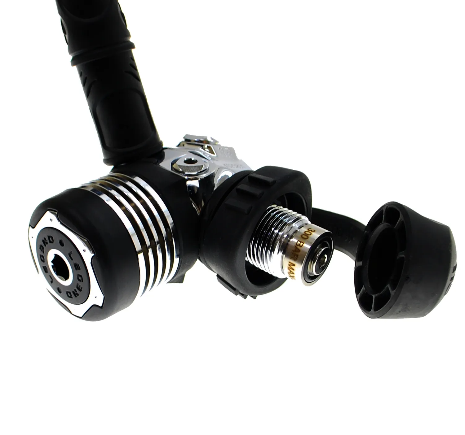 Ступень оснащена автоматическим запирающим устройством (ACD). Когда баллон отсоединен от вентиля, система ACD препятствует проникновению воды в первую ступень, изолируя ее от внешней среды при отсоединении регулятора от вентиля баллона.