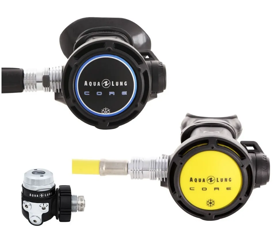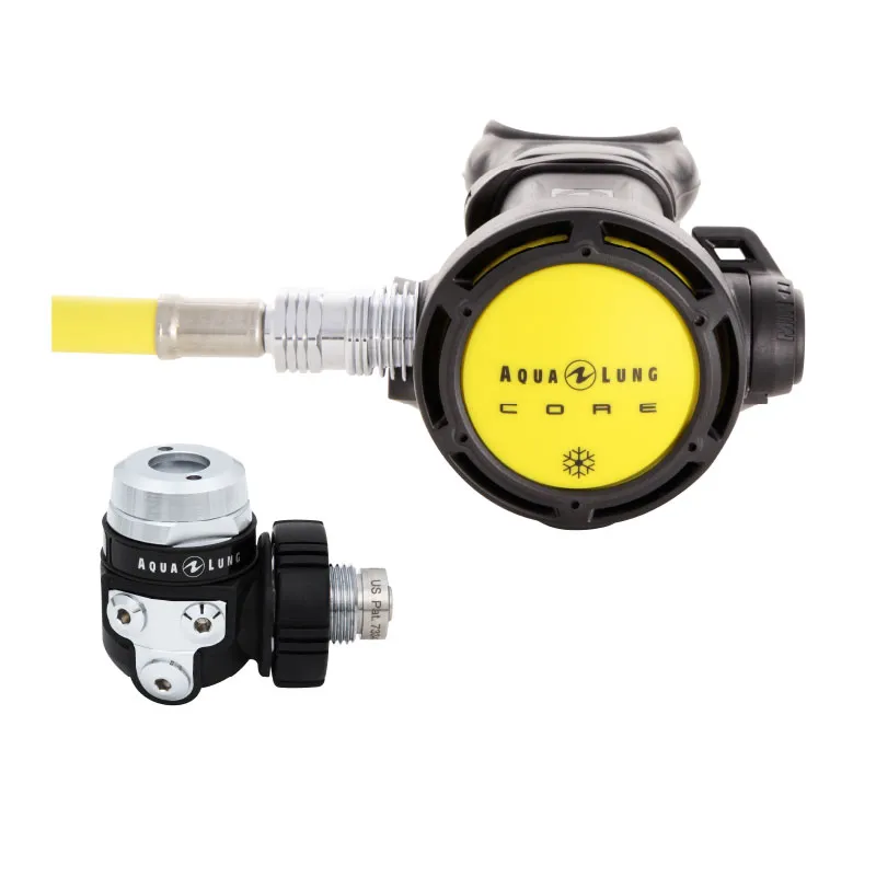 Сбалансированный комплект регулятора в комплекте с октопусом, оснащенный сухой камерой на первой ступени и подходящий для холодной воды (рекомендовано использование при температуре воды не ниже 10°).