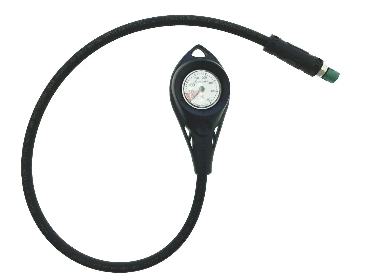 Подводный манометр – необходимый элемент безопасности, позволяющий контролировать давление в баллоне в течение погружения. Это компонент автономного дыхательного аппарата с открытым циклом и присоединяется непосредственно к первой ступени регулятора. Манометр состоит из латунного с никелированным покрытием корпуса, люминесцентного циферблата с выделенной резервной зоной, поликарбонатного экрана, защитного кожуха из эластомера и шланга высокого давления с коннектором 7/16 для присоединения к редуктору.