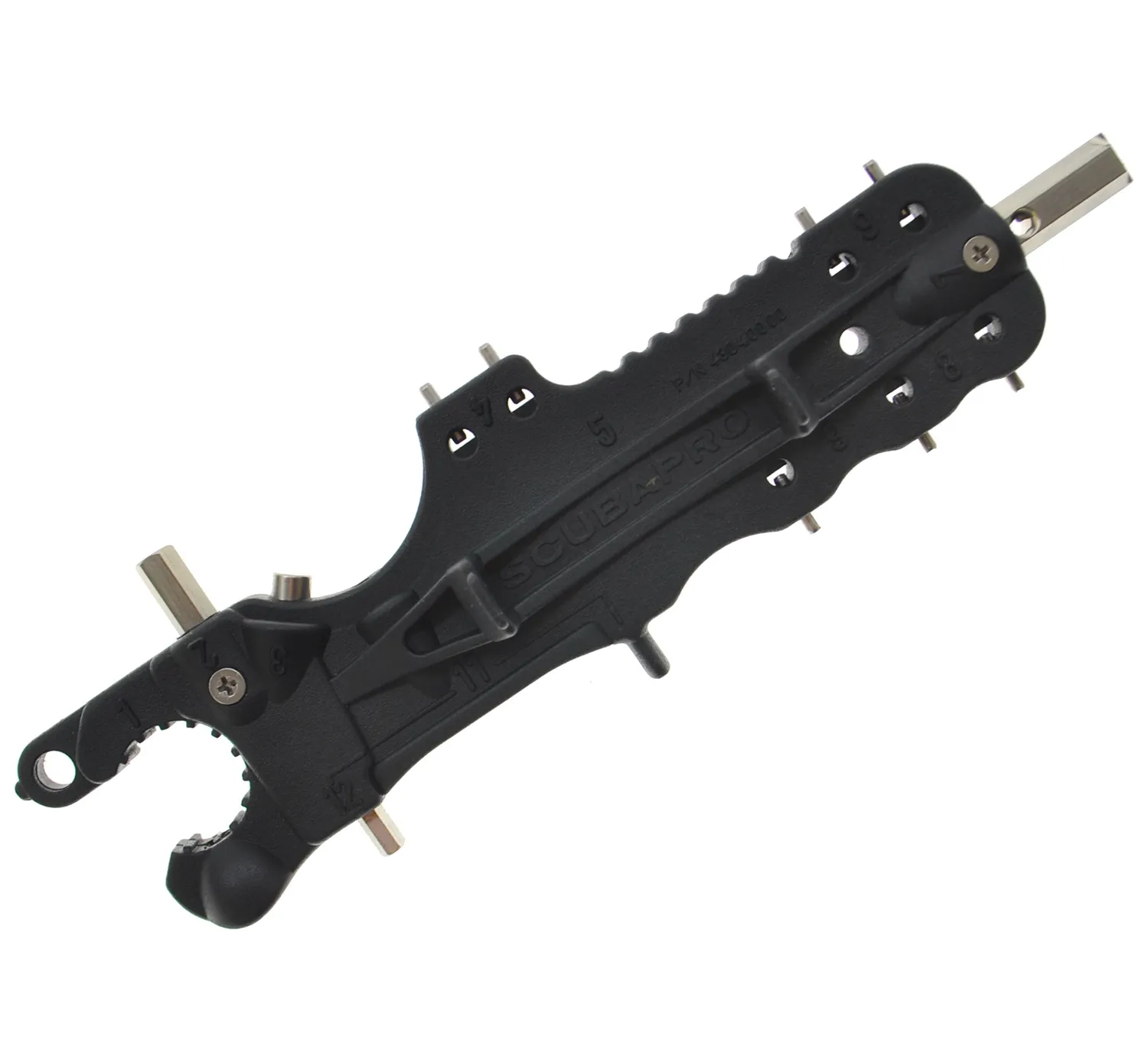 Оригинальный многофункциональный ключ, оснащён всем необходимым для сборки-разборки регуляторов SCUBAPRO.