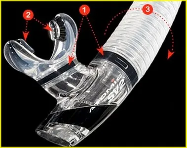 Благодаря односторонней заслонке клапана (3), вода уже не может подняться выше области дренажного клапана и легко удаляется при выдохе дайвера. Это так просто и так эффективно, что у Вас не останется сомнения в правильности сделанного выбора!