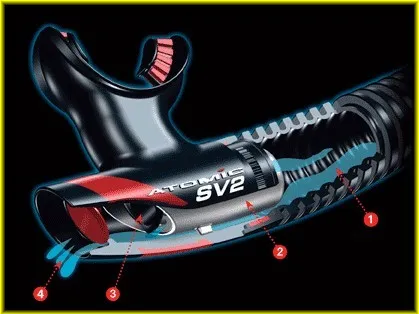 Классическая трубка с нижним клапаном от компании Atomic. Трубка оснащена очень удобным анатомическим загубником. В отличии от версии SV2 в в верхней части трубки SV1 не устанавливается сетка которая разбивает попавшую случайно воду на мелкие брызги. В остальном отличий между трубками нет.
