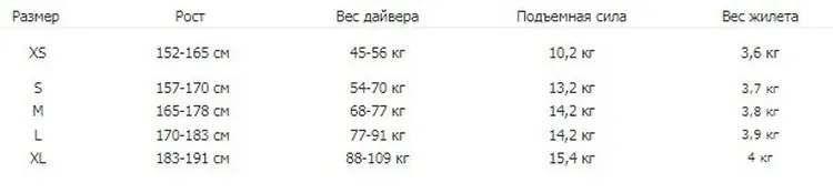 Компенсатор имеет два вместительных кармана на молнии, жесткую спинку с мягкой подкладкой и классический трёхщелевой ремень крепления баллона.